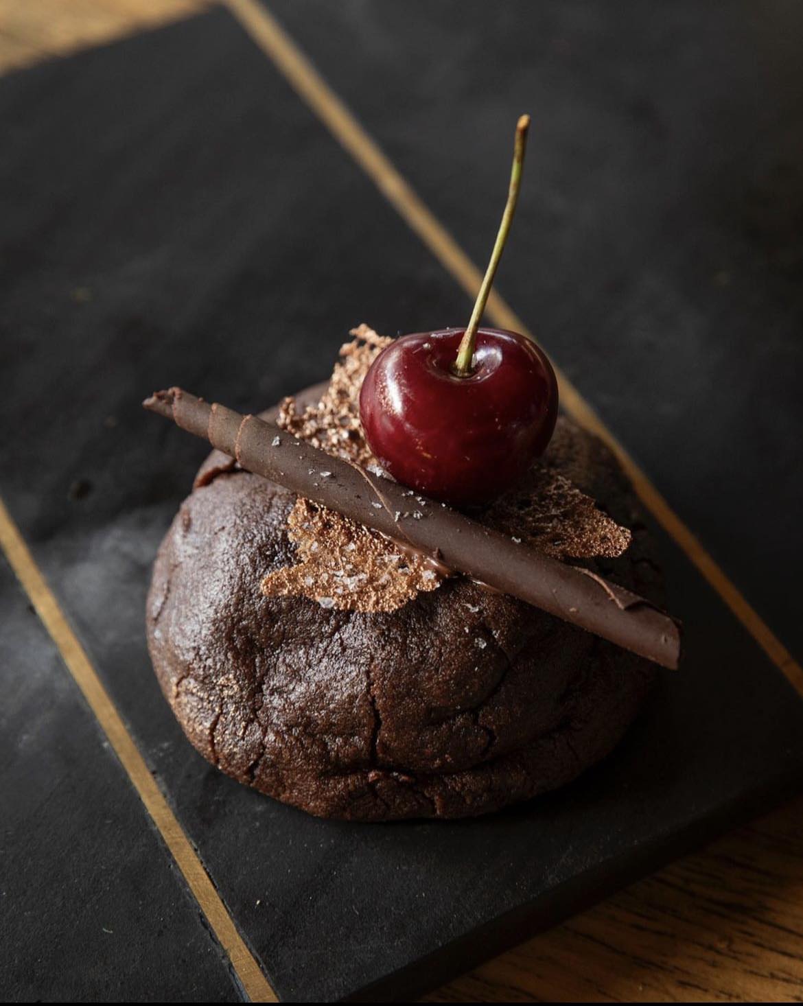 A rich 85% dark chocolate brown butter cookie filled with a cherry brandy jam centre topped with a brandy snap & fresh cherry.