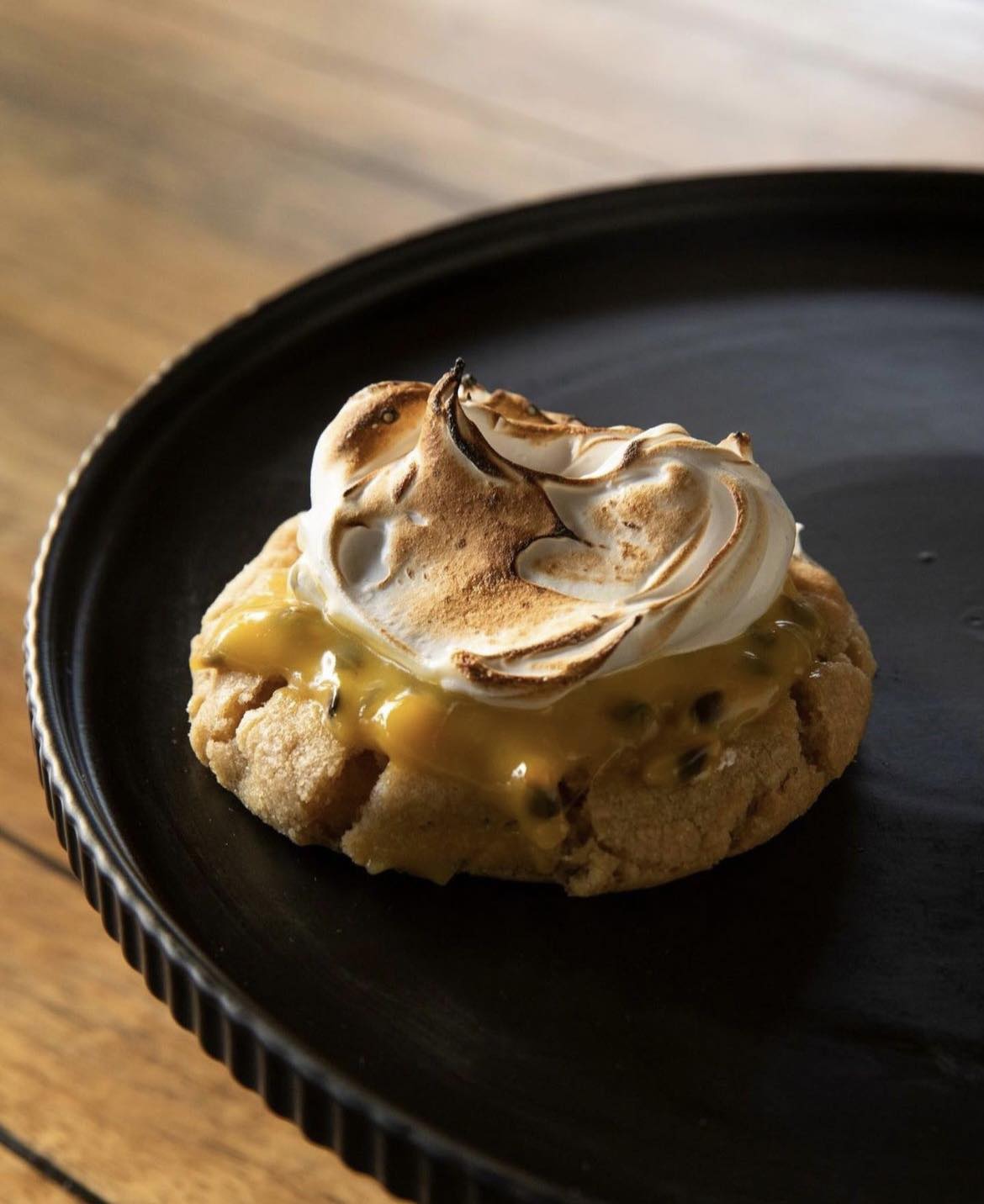 A rosemary infused citrus cookie filled with passionfruit elderflower curd finished with torched honey meruinge.