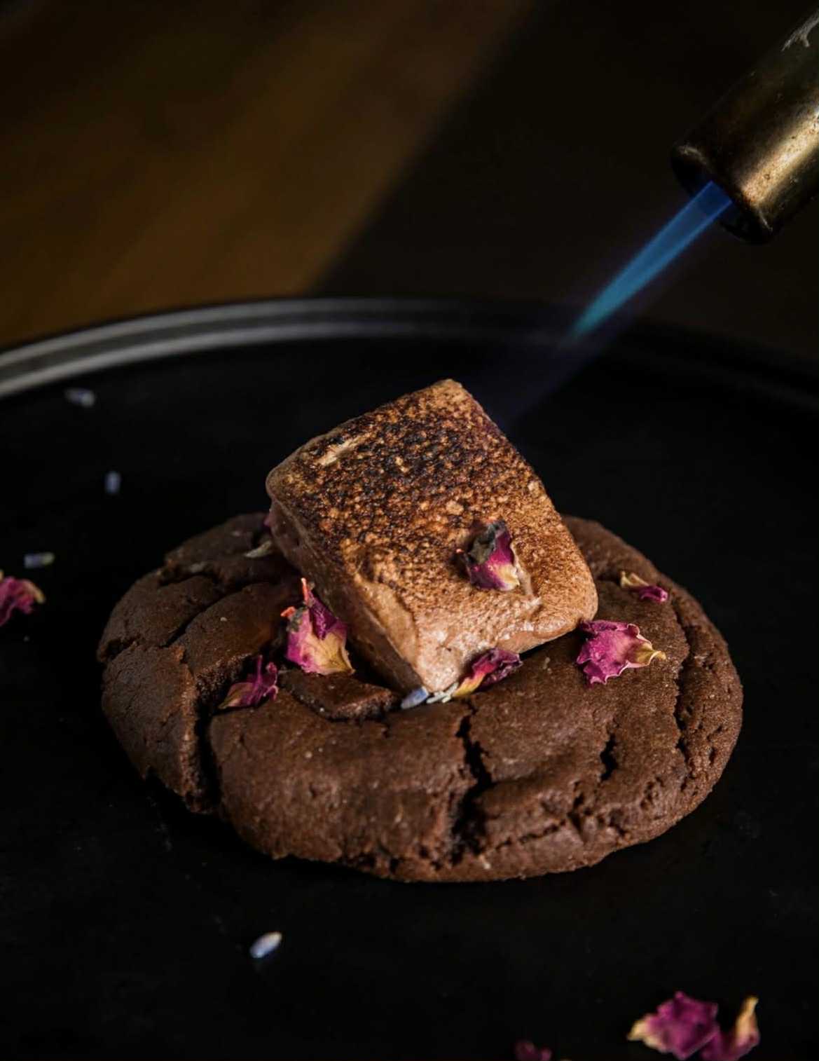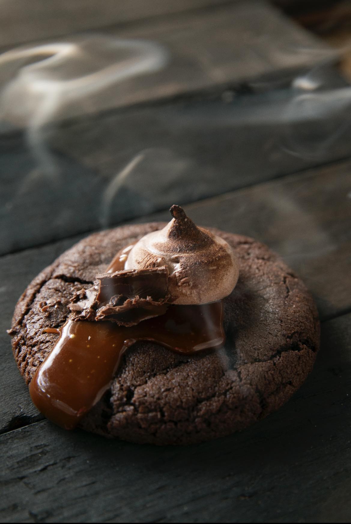 Whiskey brown butter based cookie filled with cold smoked dark chocolate, milk belgian chocolate topped with torched marshmallow. This cookie is then smoked in my smoking dome for that true campfire taste.