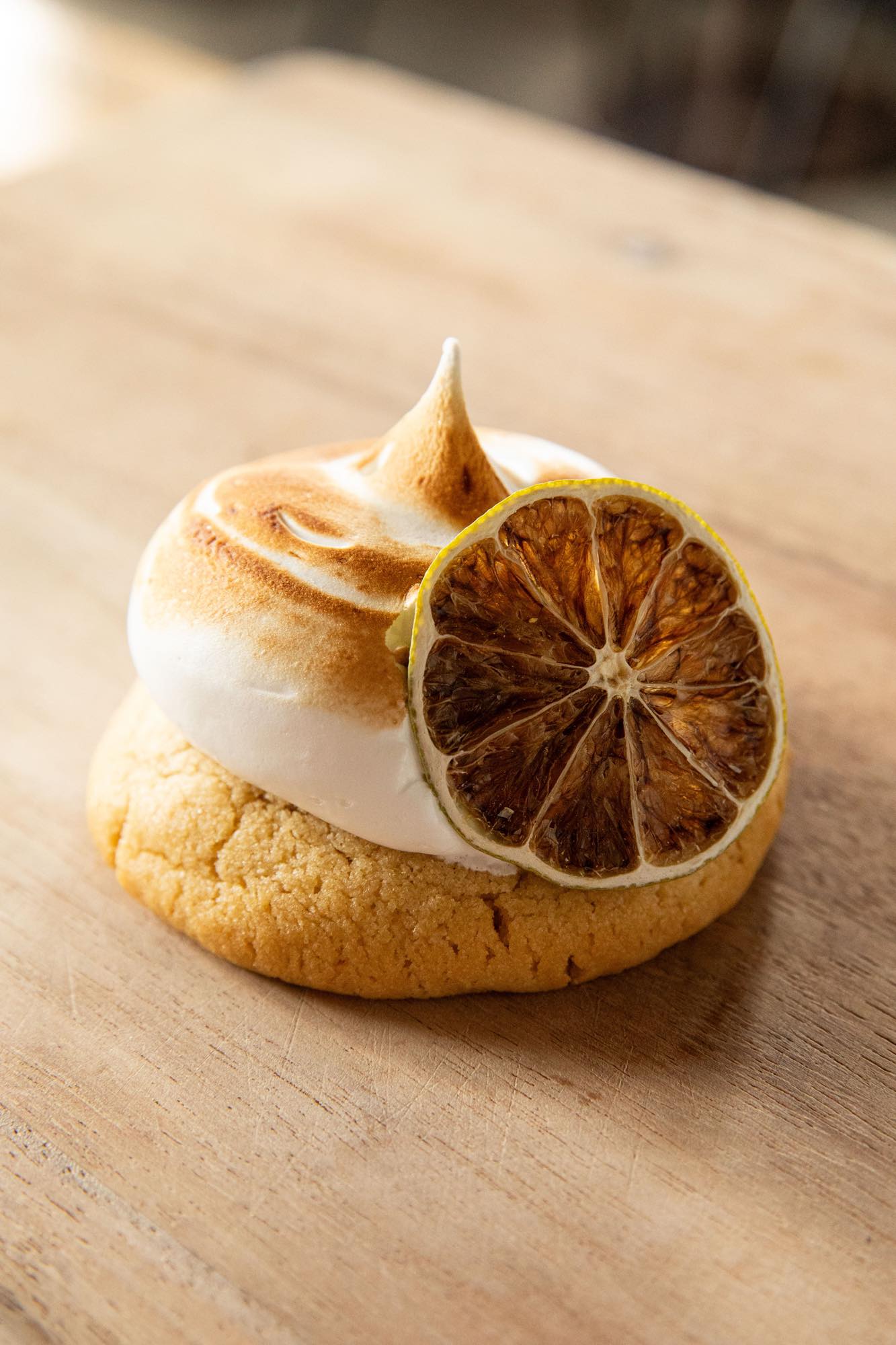 Lemon myrtle & thyme infused cookie with a lemon curd centre and torched meringue.