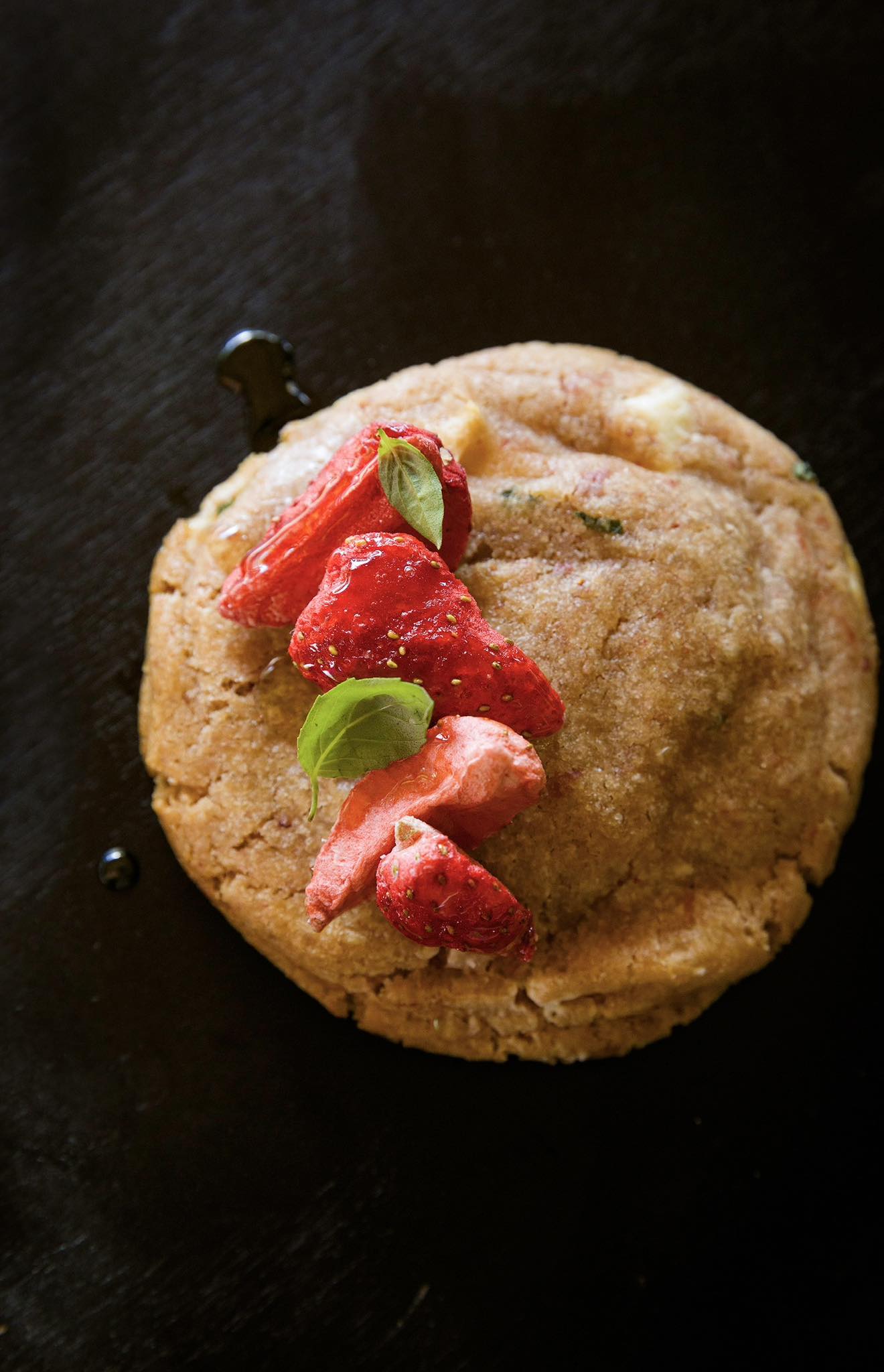 A strawberry lovers dream. A basil infused butter mixed into a strawberry dough filled with belgian white chocolate finished with fresh herbs.