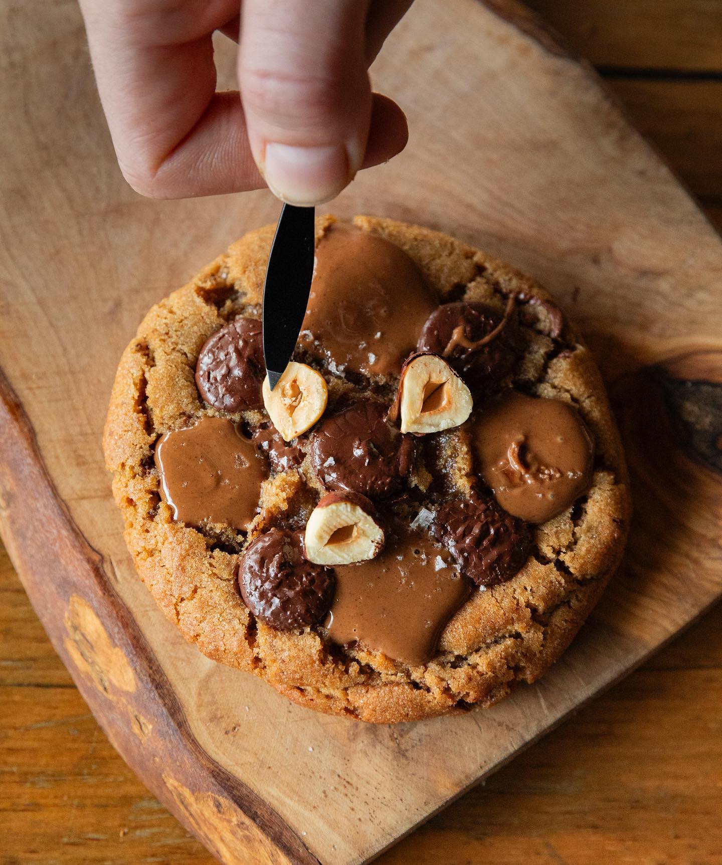 Rich espresso based cookie flooded with bitter sweet dark chocolate & hazelnut praline. Finished with roasted hazelnuts and sea salt.