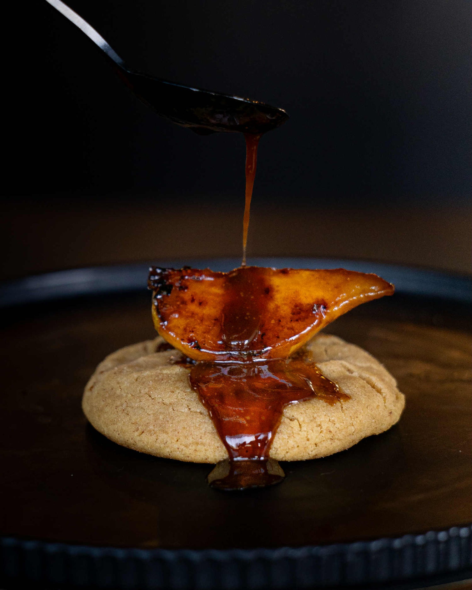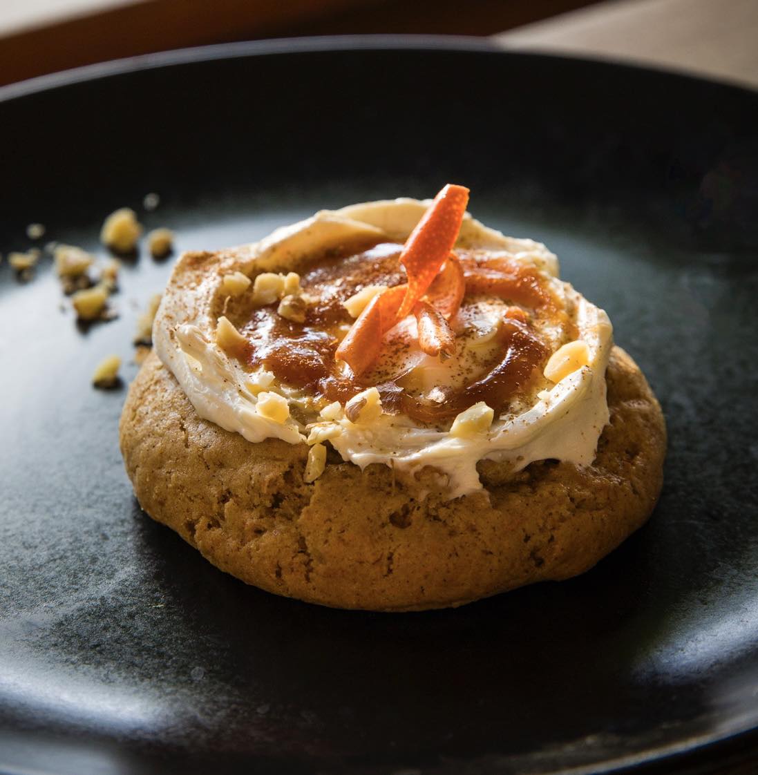 Spiced carrot cake cookie filled with orange marmalade cream cheese topped with candied walnuts and orange caramel.