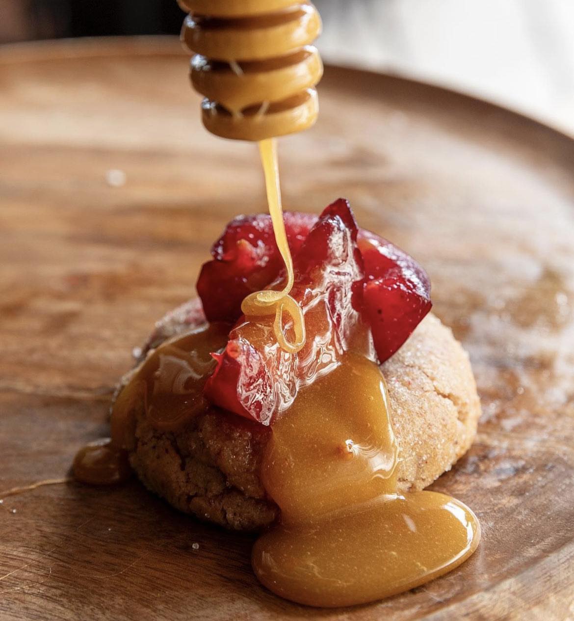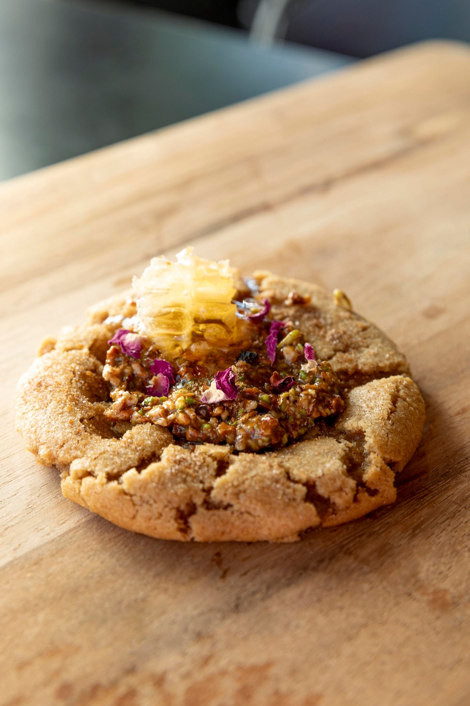 A brown butter pistachio cookie base twice baked filled with a cinnamon nut centre and drowned in fresh local honeycomb.