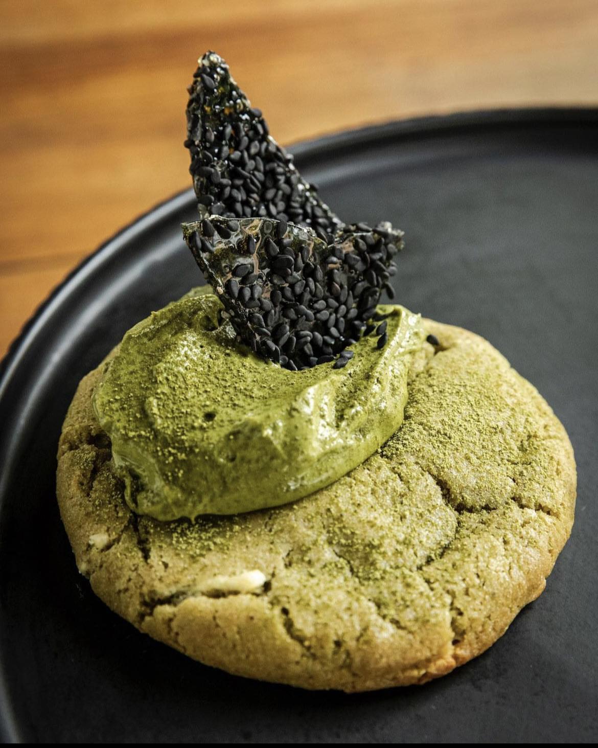A matcha infused cookie with caramelized white chocolate finished with a matcha cremeux and black sesame crisp.