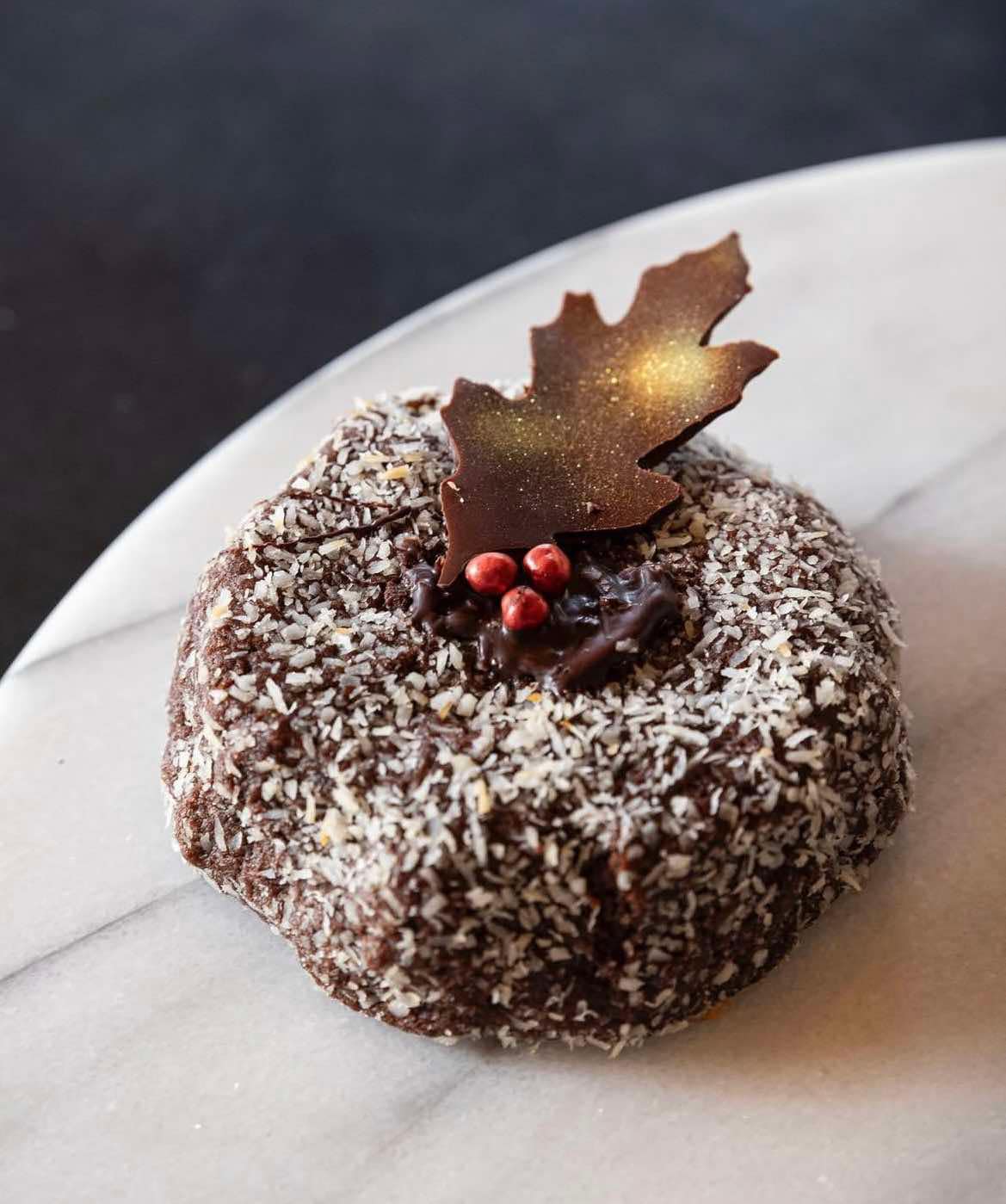 A boozy rich christmas classic with a twist. Dark chocolate rum infused dough filled with rum soaked raisins, belgian dark chocolate rolled in coconut.
