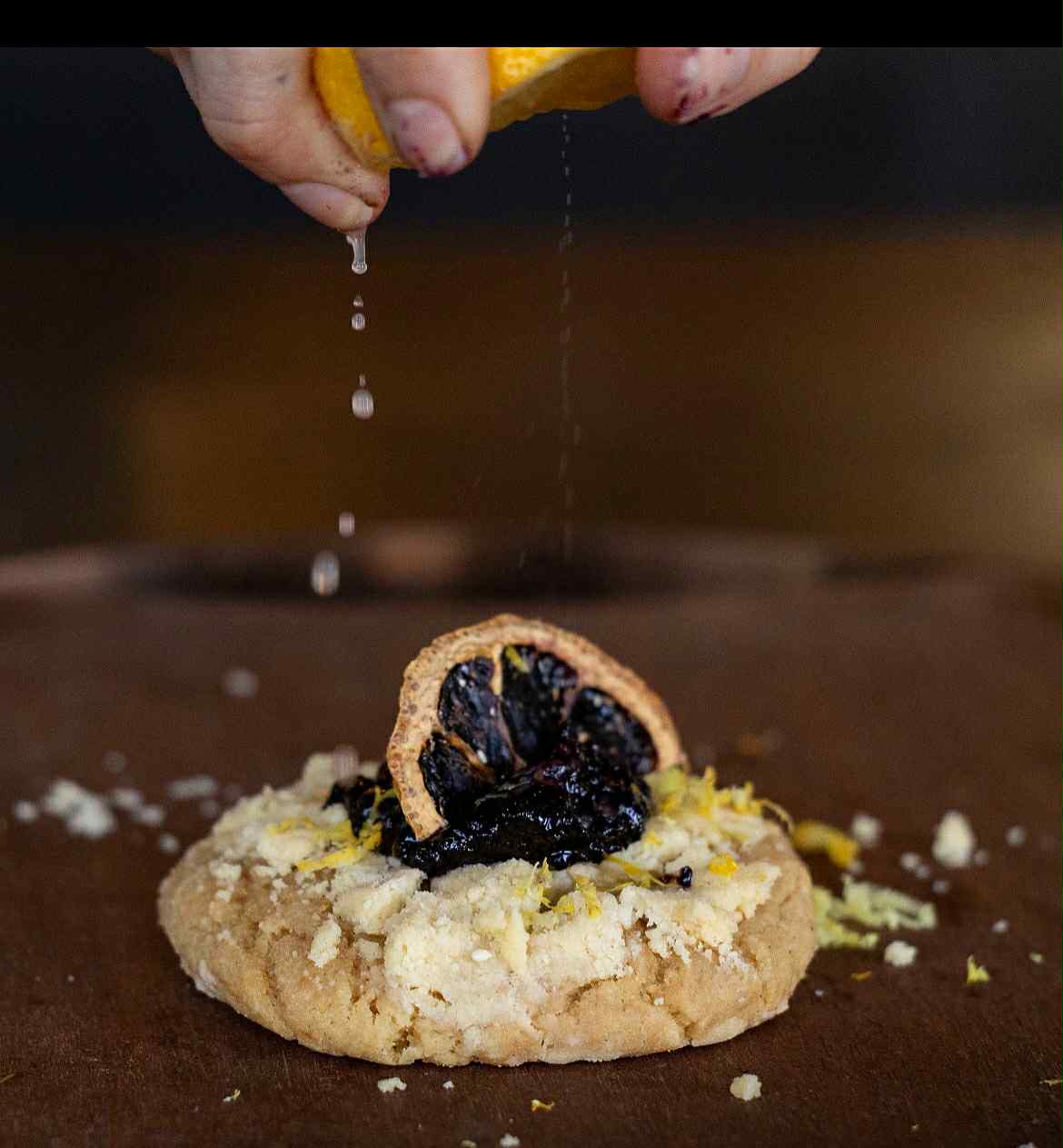 Zesty lemon oil infused cookie dough filled with limonchello spiked cream cheese, topped with blueberry compote & dehydrated lemon.