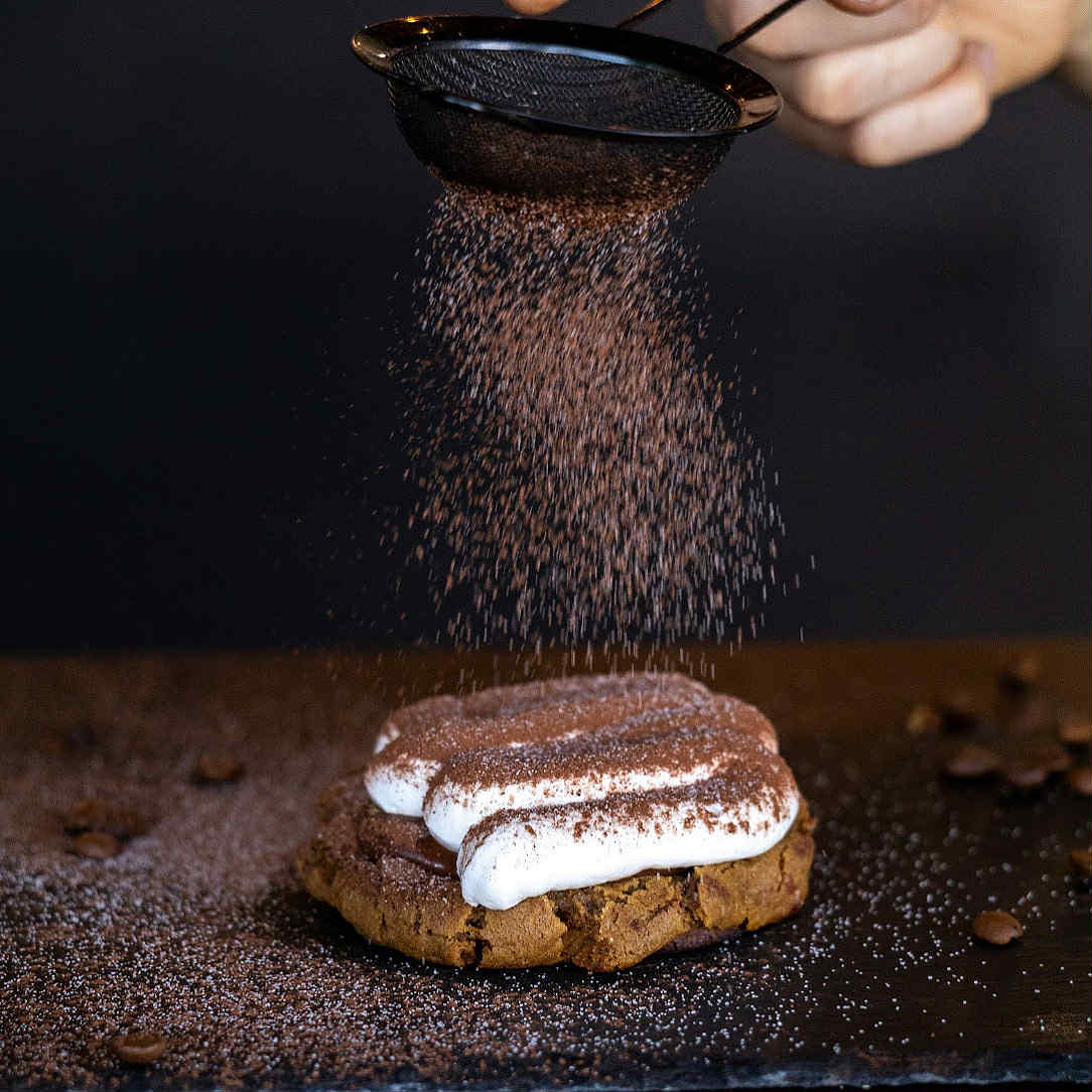 A coffee lovers dream... This cookie is a twist on the classic tiramisu. A nutty coffee infused cookie dough filled with chocolate kahlua ganache topped with a coffee infused meringue!