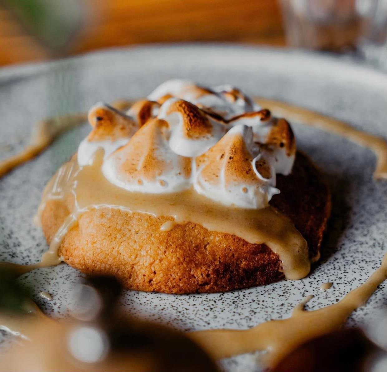 A dark chocolate whiskey infused cookie filled with cold smoked chocolate - topped with burnt whiskey salted caramel & wattleseed meringue.